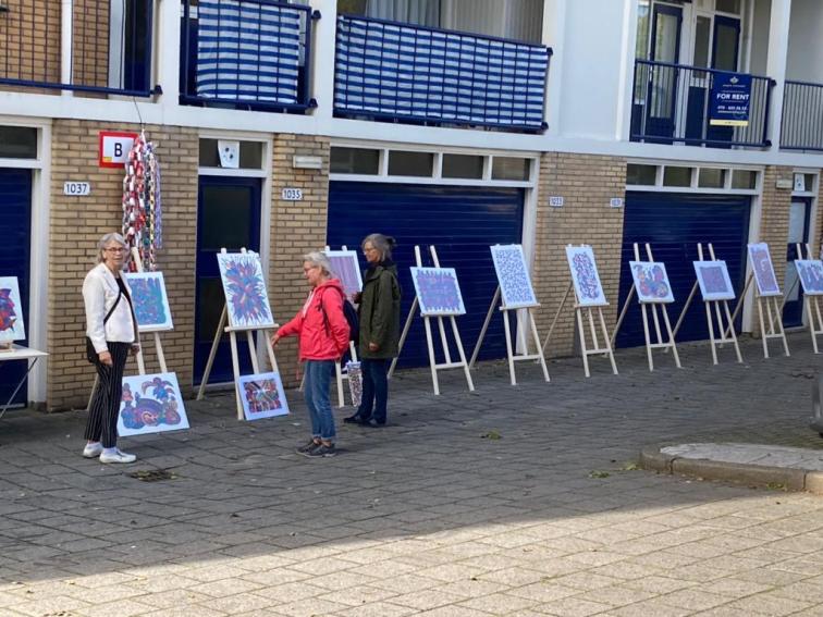Exposeren kan ook gewoon eens voor de deur…op 26 september organiseerde Ans Ruijters-Hoff een openlucht expositie van haar eigen kleurrijke werk. Gewoon op de parkeerplaats voor de deur waar ze woont in de Landrestraat in Loosduinen. En over bezoek was niet te klagen, met gemak op 1,5 meter afstand op de parkeerplaats en in de openlucht! Meer werk zien van Ans? Klik verder naar haar webpagina’s Cre-Ans of kijk hieronder nog naar de video op de parkeerplaats!