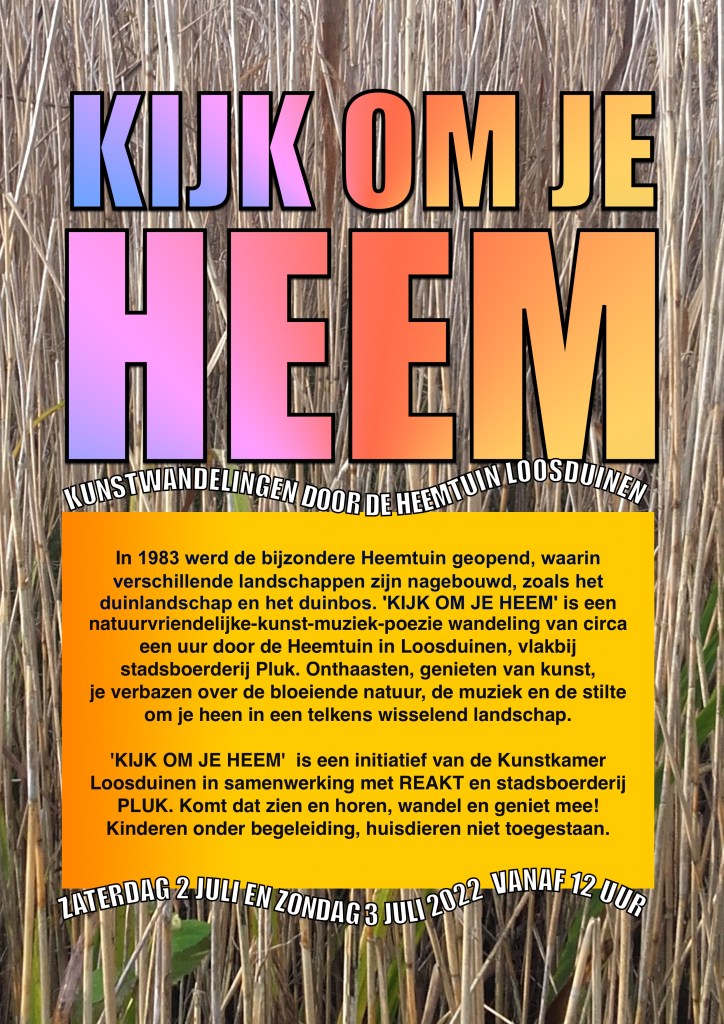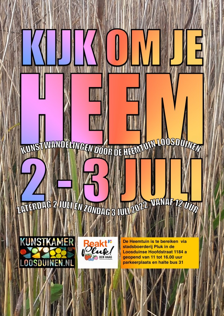 Op zaterdag 2 juli èn zondag 3 juli heerlijk wandelen in het wisselend landschap van de Loosduinse Heemtuin in een kleine kunstwandeling in de natuur van circa een uur. ’KIJK OM JE HEEM’ is een kunstproject van de Kunstkamer Loosduinen met dank aan de gemeente Den Haag /stadsdeel Loosduinen, fonds 1818 en in samenwerking met Reakt en stadsboerderij Pluk. De Heemtuin is vrij toegankelijk via een kleine brug bij stadsboerderij Pluk. Bij de brug naar de Heemtuin is meer informatie over de route, de wisselende activiteiten tijdens de wandeling en over de deelnemers van de Kunstkamer Loosduinen. Wandel, kijk, luister en geniet mee!