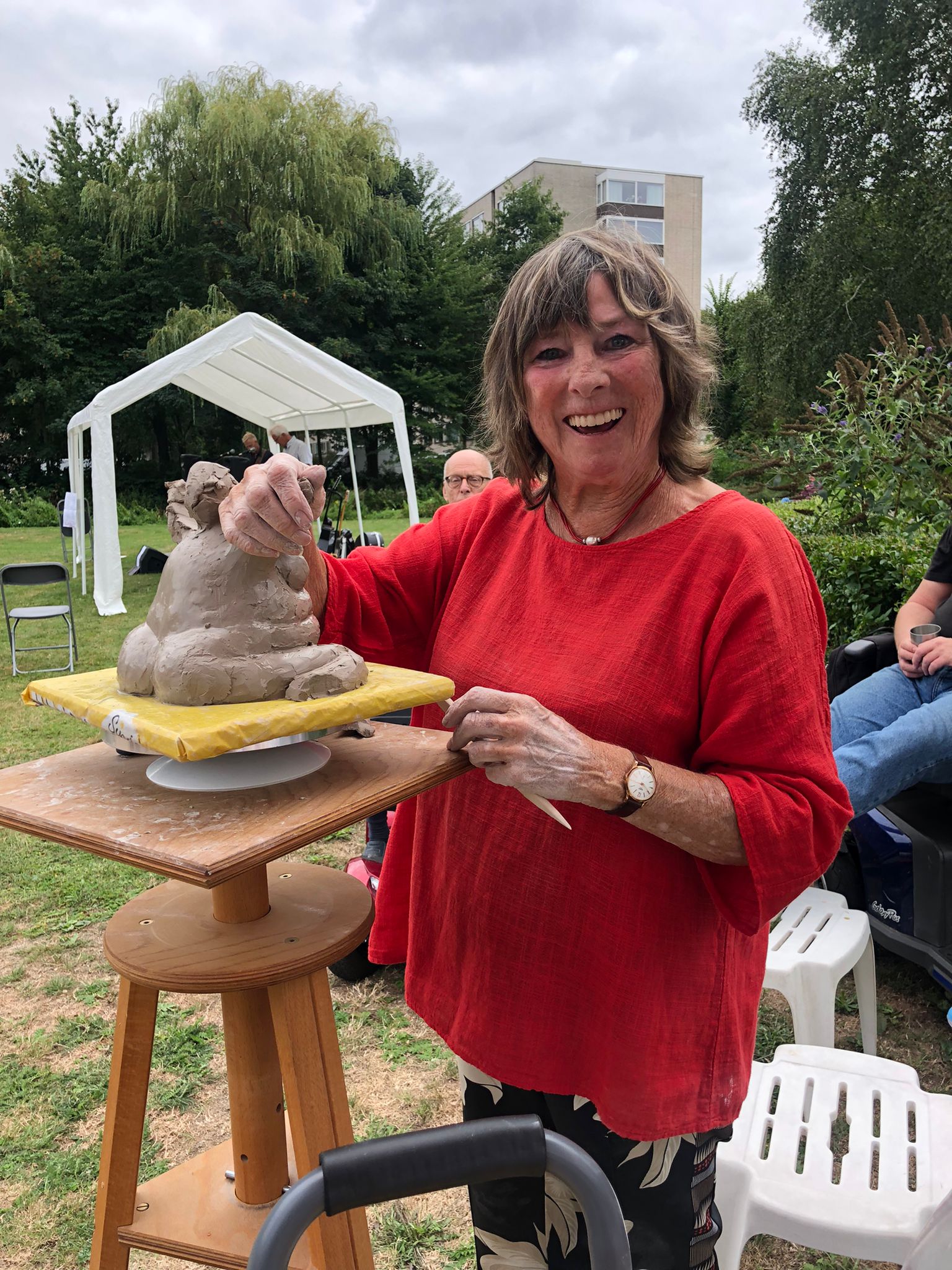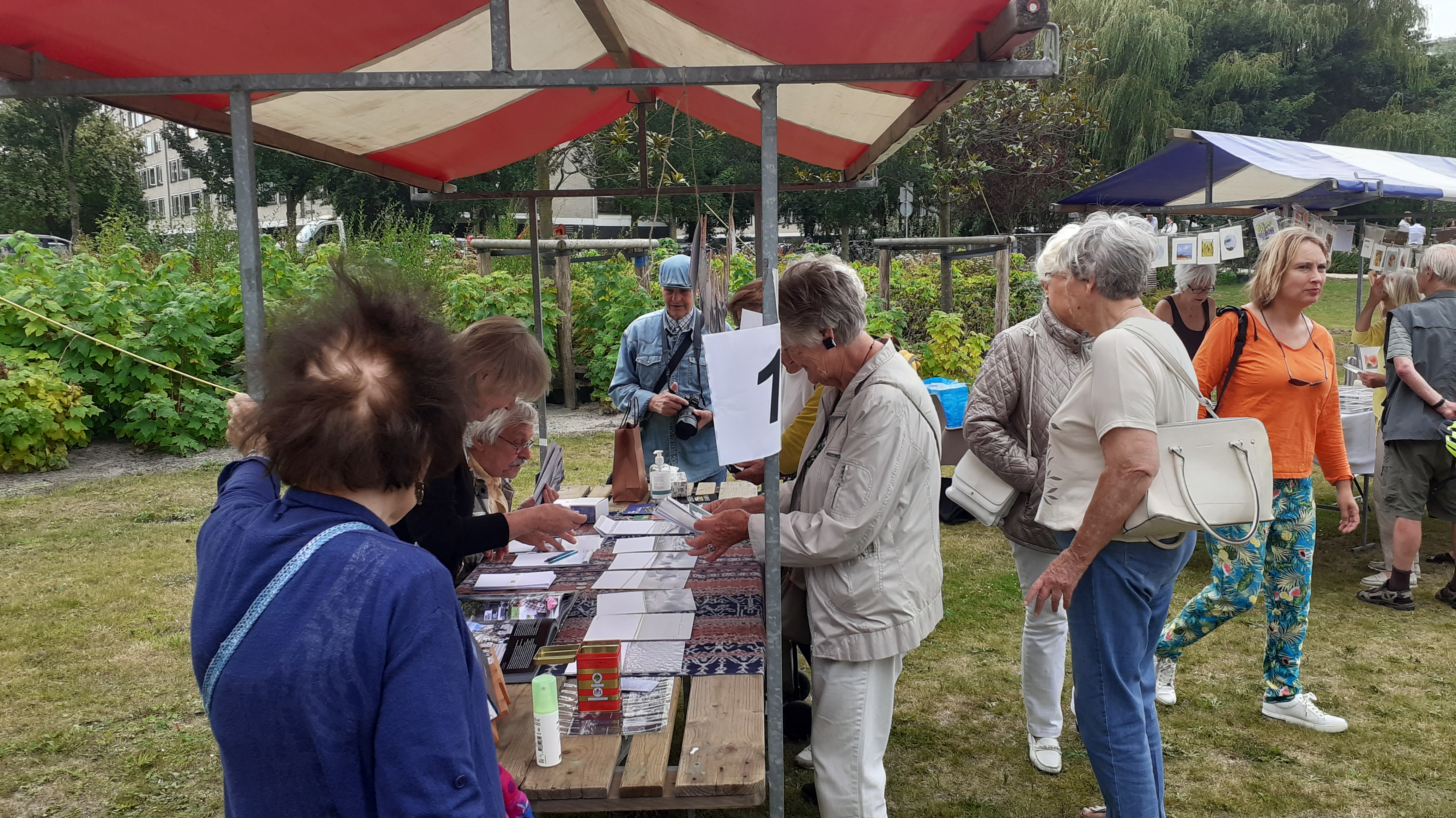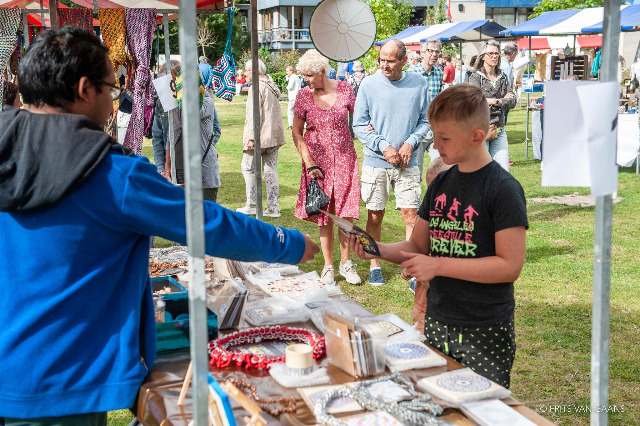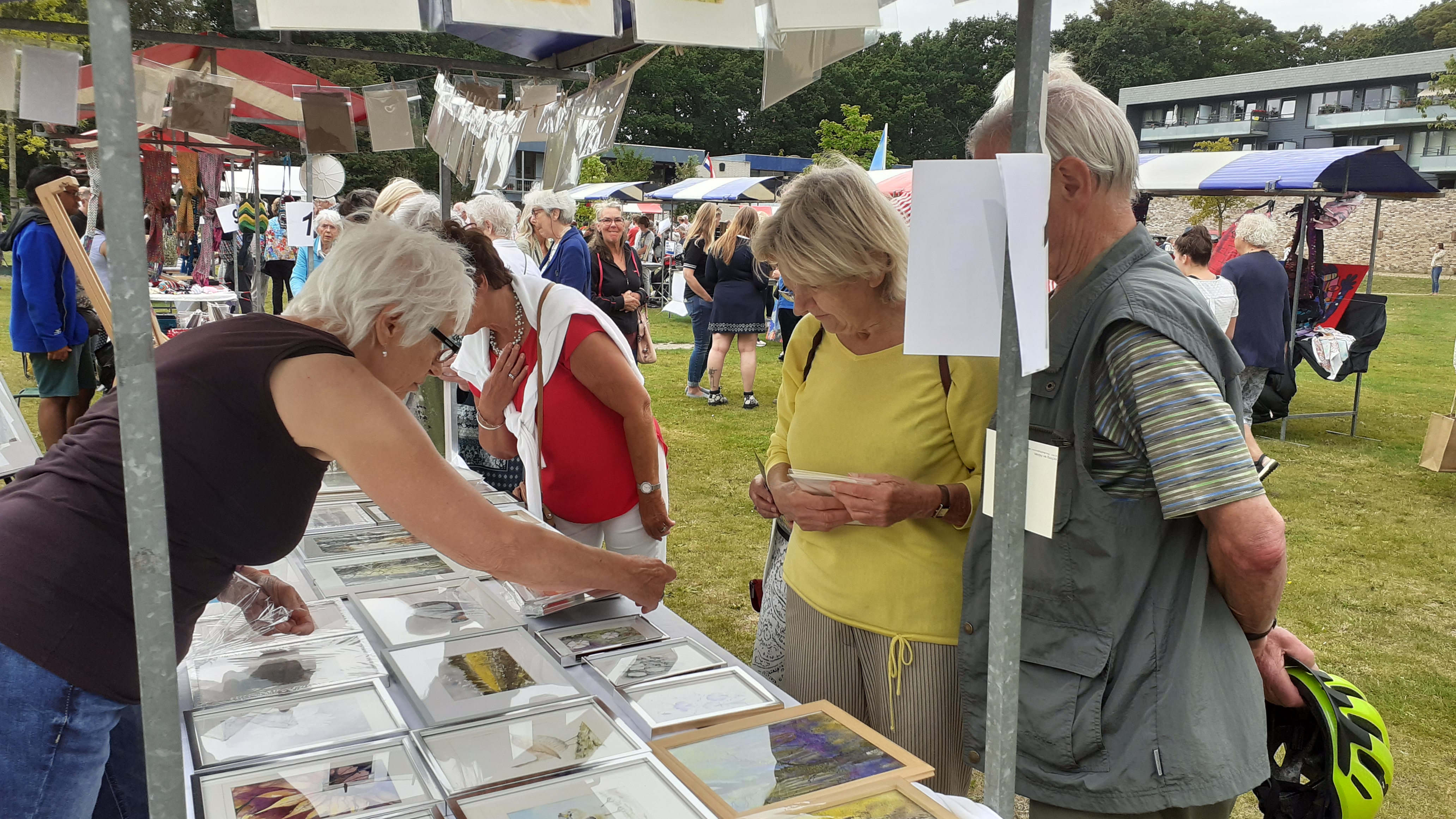 Burgemeester Jan van Zanen mocht met het aansnijden van een kleurrijke taart de eerste Kunstmarkt in het Mozartpark officieel openen. Na een bezoek aan de expositie ‘Om Op te Eten’ van deelnemers van de Kunstkamer Loosduinen volgde samen met stadsdeeldirecteur Mustapha el Boumeshouli een ronde langs de druk bezochte kramen in dit nieuwe park aan de Mozartlaan; het eenjarig bestaan van het Mozartpark mocht samen met de bewoners gevierd worden! Schilderijen en collages in diverse maten en kleuren, viltkunst, fotografie, beelden, keramiek, mozaïek werden bekeken, gekeurd en gekocht. Een goed bezochte Kunstmarkt waarbij ook de kinderen zelf aan de slag konden met schilderen en boetseren bij de kramen. Onderwijl met veel applaus muziek optredens van Harmonie Tavenu, Johnnie Cash Tribute en duo Joop Colsen. Alle vrijwilligers, deelnemers, bewoners en vrienden van het Mozartpark en de Kunstkamer Loosduinen werden bedankt voor hun inzet op deze feestelijke dag!