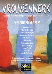 De officiële opening van de expositie VROUWENWERK is natuurlijk op Vrouwendag, woensdag 8 maart tussen 11 en 12 uur en wordt verricht door de nieuwe Loosduinse stadsdeeldirecteur Corinne den Heijer. Daarna is de expositie nog elke zaterdag in maart van 11-16 uur te zien in de tijdelijke expositieruimte in het Wingsgebouw en is gratis toegankelijk. Entree via de brug naar het Mozartpark. Volg de borden! Een groepstentoonstelling met werk in verschillende technieken van de vrouwen Joke Bianchi, Patty van der Ende, Tineke Groenewegen, Anita Jacobs, Johanna van der Hoogt, Pat Houkes, Jessica Reuling, Annelies Overdijk, Immie Schilt, Ada Sinke en Jenneke Zoutenbier. Komt dat zien!