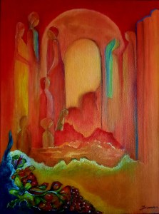 In de loop van de jaren ben ik naast intuïtief schilderen ook figuratief gaan schilderen. De opzet is echter altijd intuitief. Ik noem dat spelen met kleuren, vlakken en lijnen. Daarna draai ik mijn werk alle kanten op en zie wat er ‘verschijnt’. Ook gebruik ik de penseelstreken die intuïtief zijn geschilderd.
