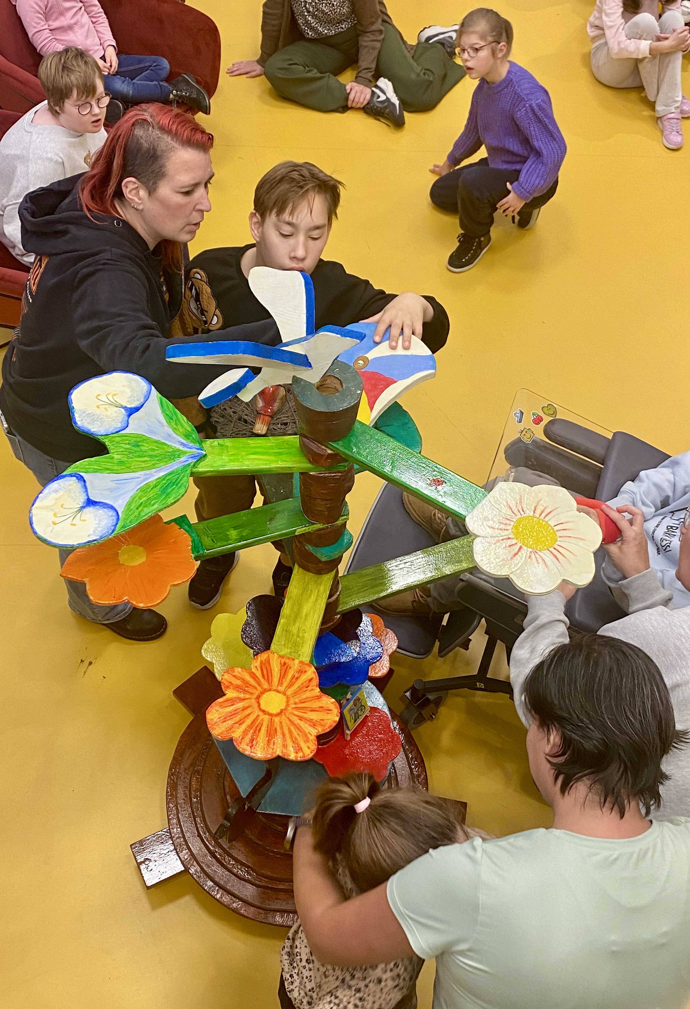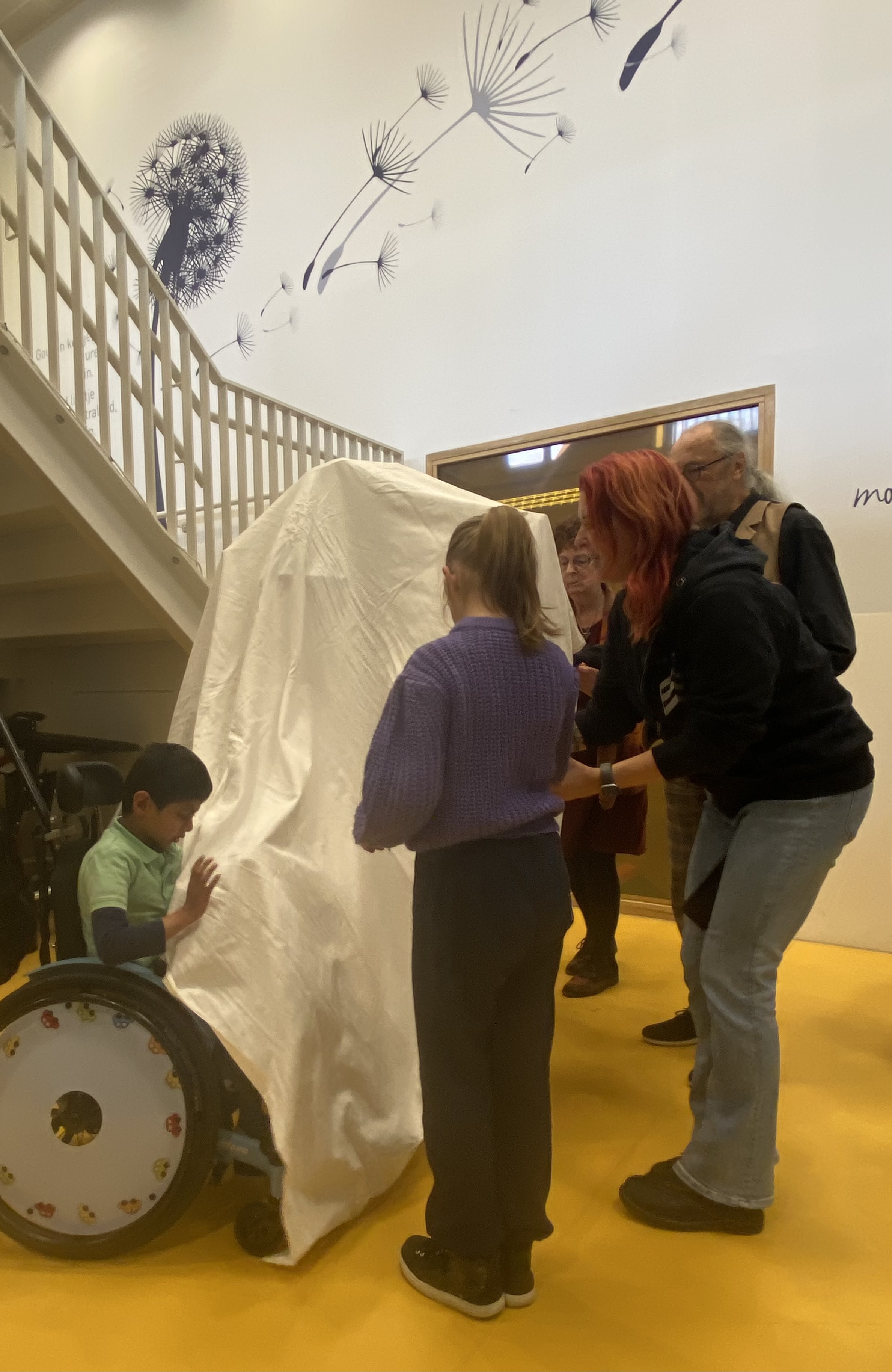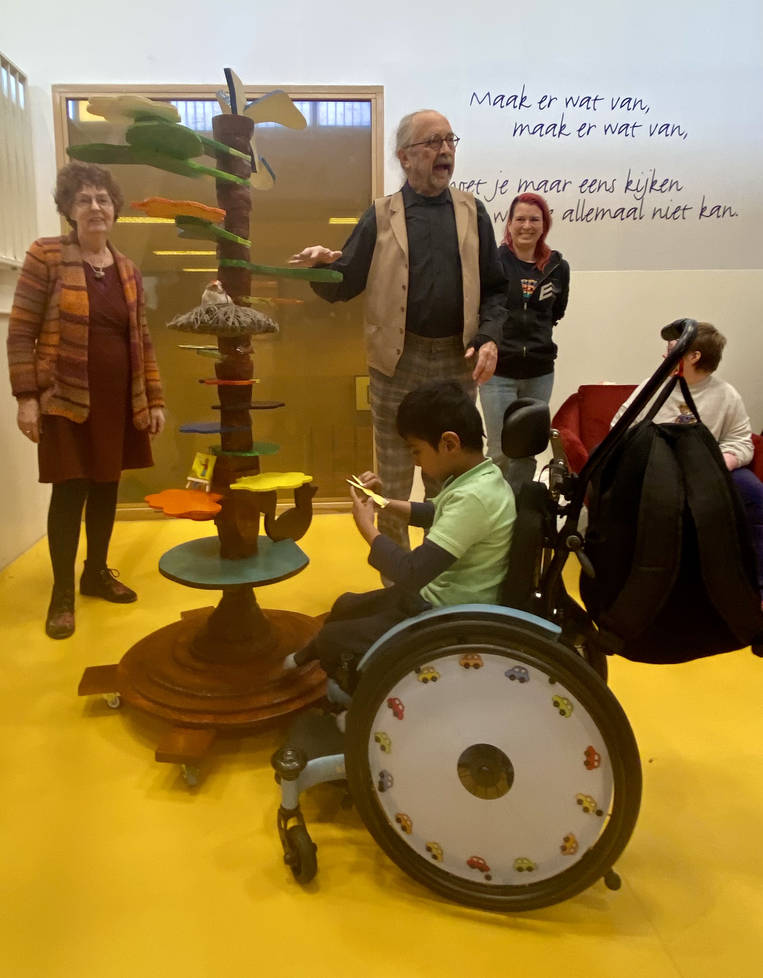 Er waren een paar belangrijke eisen voor de boom: attractief, bestand tegen rolstoelen, makkelijk verplaatsbaar. De boom werd op 28 oktober onthuld in de hal van het centrum. Er waren veel kinderen bij die gelijk enthousiast met de boom gingen spelen.